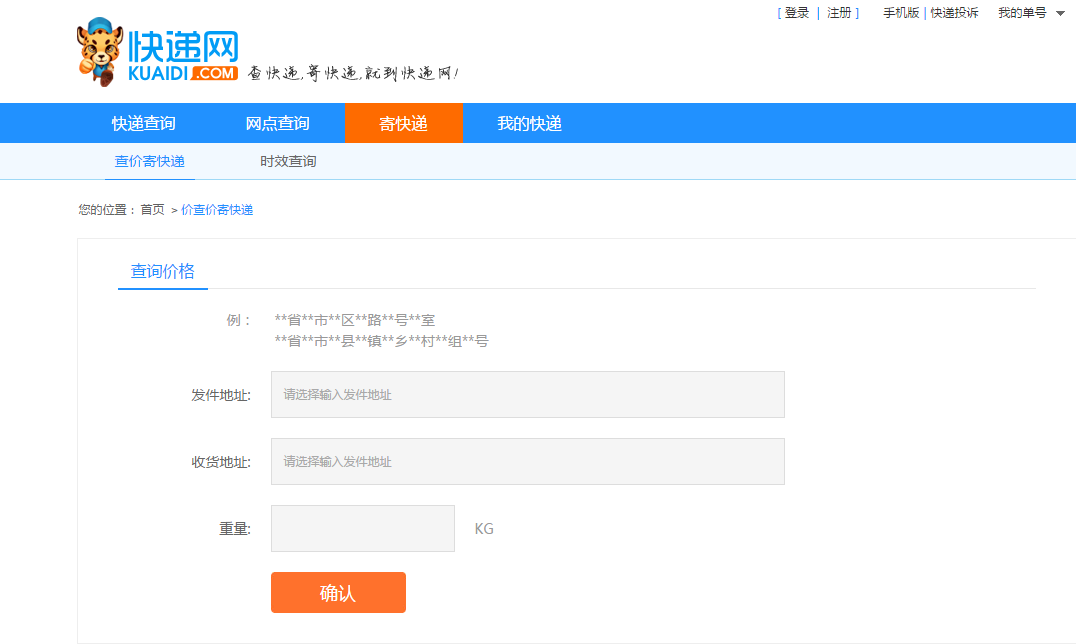 第一步:打開網(wǎng)站地址http://www.taobaotc.com/orderindex.html, 在“查價寄快遞”頁面輸入您的發(fā)件地、收件地以及重量,點擊“確認”。