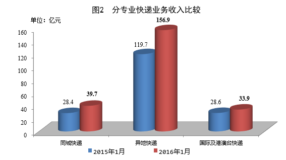 1月,同城、異地、國(guó)際及港澳臺(tái)快遞業(yè)務(wù)收入分別占全部快遞收入的13.6%、53.8%和11.6%;業(yè)務(wù)量分別占全部快遞業(yè)務(wù)量的24.8%、73.2%和2.0%。與去年同期相比,同城快遞業(yè)務(wù)收入的比重上升0.2個(gè)百分點(diǎn),異地快遞業(yè)務(wù)收入的比重下降2.9個(gè)百分點(diǎn),國(guó)際及港澳臺(tái)業(yè)務(wù)收入的比重下降了2個(gè)百分點(diǎn)。
