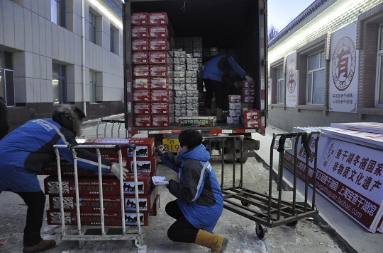 查干湖冬捕,即查干湖冬季冰雪漁獵,是一種極其傳統(tǒng)的漁業(yè)生產(chǎn)方式,始于史前、盛于遼金,延續(xù)至今千年未變,當?shù)貪O民被稱為“最后的漁獵部落”。12月末到春節(jié)前是查干湖冬捕的黃金時間,漁民借助馬拉絞盤的力量在冰下行網(wǎng)捕魚,其盛大的場景每年都吸引著數(shù)萬國內(nèi)外游客前來觀看。2011年,中通吉林松原公司開通了查干湖承包區(qū),推出了“大美查干湖、中通鮮到家”的宣傳口號,并自行購置加厚紙箱、保溫箱等專業(yè)包裝材料,為寄遞客戶提供免費包裝服務。如今,查干湖分部承包區(qū)日發(fā)件量500票以上,名列松原公司首位,也為查干湖魚的對外銷售打開了一條新通道。